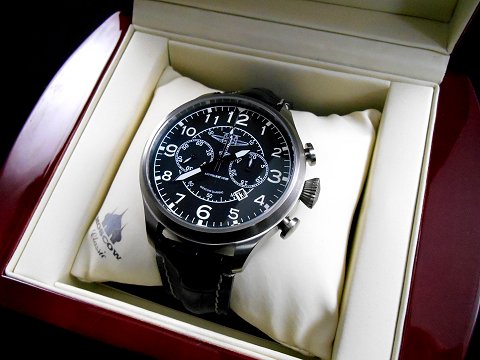 Although based in Poland, Moscow Classic designed chronographs, for the most part, have a Russian theme to them. This particular dial has an image of - what I'm guessing is - a Soviet WWII-era bomber. It is, however, impossible to tell which one because not all elements match any one particular aircraft, which is too bad because in my opinion a more exact depiction would have added to desirability of the watch. It also features a metric decimalized-time sub-dial and a mix of Cyrillic and Latin script that claims "Made in Russia".