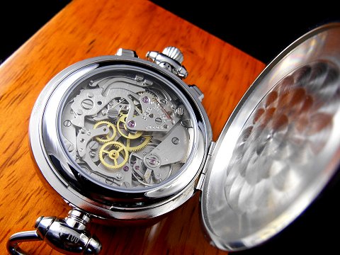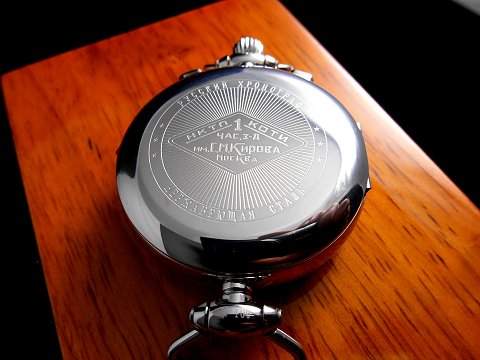 A very detailed hinged case back stamped the Cyrillic script "Russian Chronograph", the acronym for the "People's Commissariat of Heavy Industry of the USSR", and "1st Kirov Moscow Watch Factory".