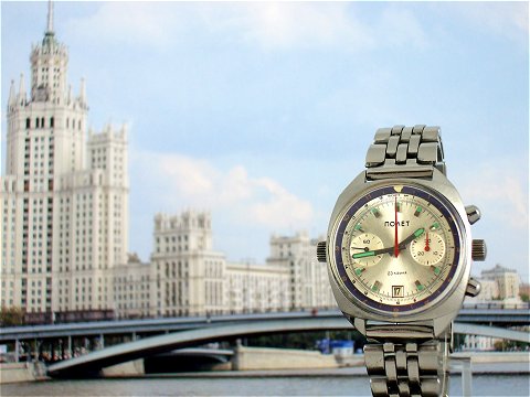 The Cyrillic dial is somewhat rare, as is the red and blue bezel with the white luminance. This chronograph also features a stainless steel casing.