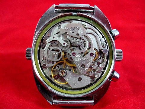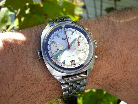 An "as-new" early Cyrillic dial presumably produced for the domestic market. It's hard to place an exact date on this watch, but I believe it would be safe to say that it pre-dates 1982 because a chronograph identical to this one appears on the front cover of the 1982 catalogue. My best guess based on the original movement would be ca. 1979. And although it has been stated that Poljot cal. 3133 chronographs were not available to the public before 1983, I find this difficult to believe because Poljot cal. 3017 production stopped in 1978, and therefore no chronographs would have been produced between 1978-1983 - even though the original movement produced in 1976 was worthy of military-service.