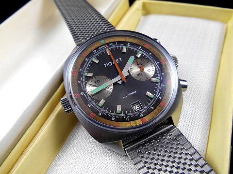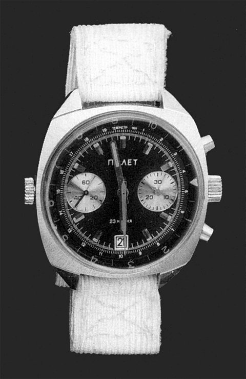 Obviously, chronographs fitted with the black "Poljot"(Cyrillic script) dial were initially produced for the military. It's interesting to note that Gorbatko wore this model into space instead of the Sturmanskie?