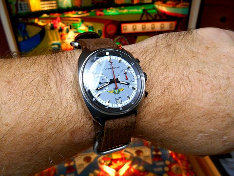 Leather NATO strap on a Soviet BBC Sturmanskie. The pinball game is actually much older than the watch!